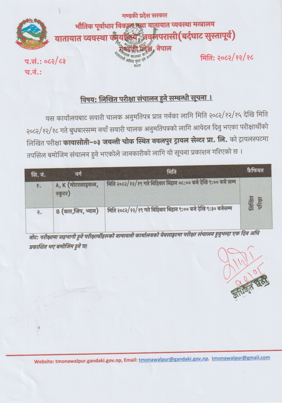 मिति २०८२/१२/१९ गते लिखित परीक्षा संचालन हुने सम्बन्धी सूचना