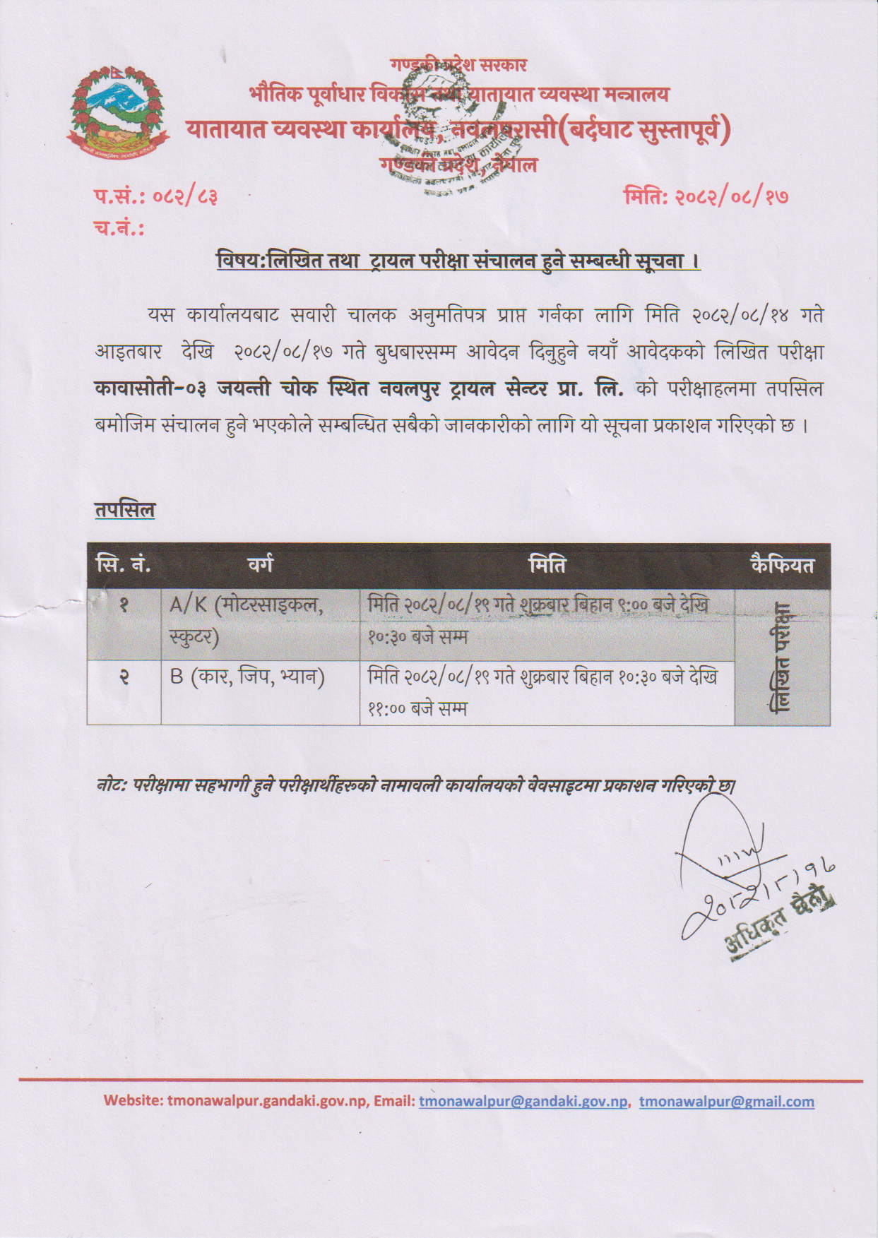 मिति २०८२/०८/१९ गते शुक्रबार संचालन हुने लिखित परीक्षाको सूचना तथा नामावली