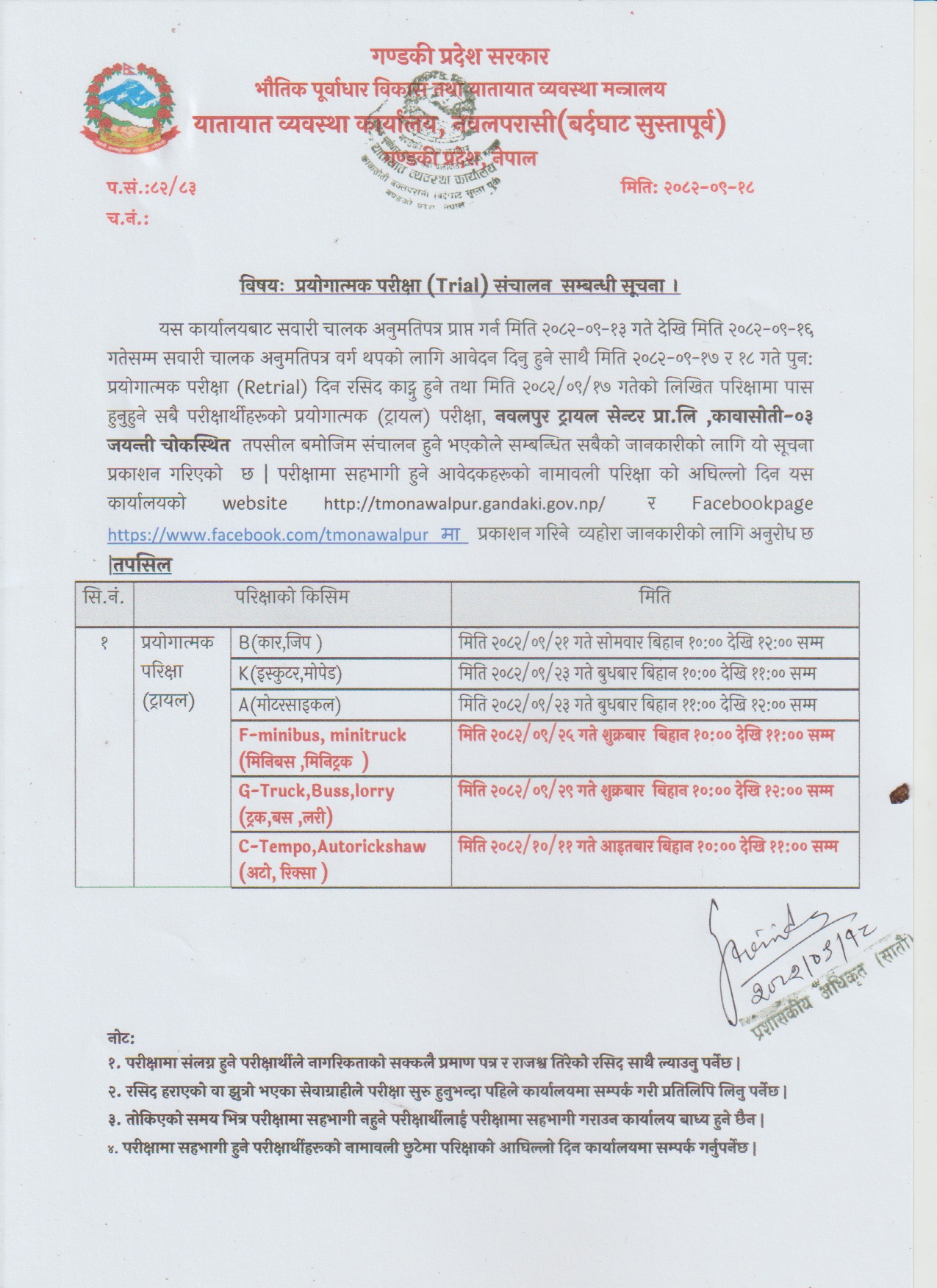 मिति २००८२-०९-२१ देखि २५ हुने ट्रायल परीक्षाको सूचना