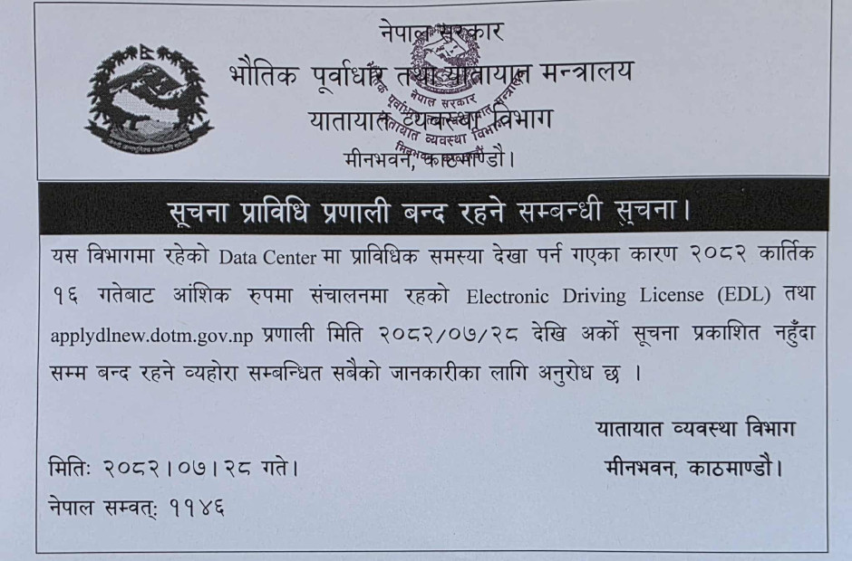 सवारी चालक अनुमतिपत्र प्राणाली अनिश्चित कालको लागि बन्द गरिएको सूचना