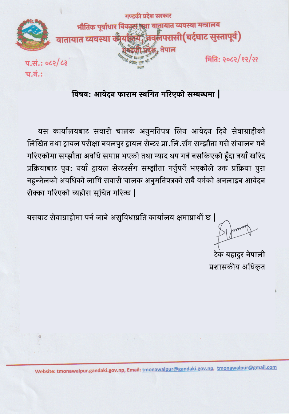 सवारी चालक अनुमतिपत्रको अनलाइन आवेदन स्थगित गरिएको सूचना